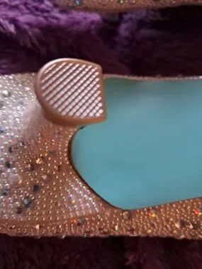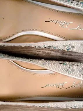 I purchased these online for a party, but did not realize recent weightloss affected shoe size. They are a whole size too large. Elegant pointed-toe heels by Betsey Johnson. Covered in pearl beads and sparkling rhinestones. Dressed up for special occasions. Eye-catching iridescent accents throughout.