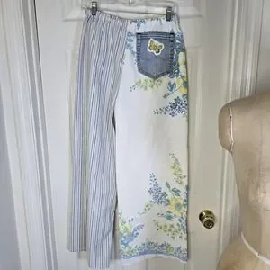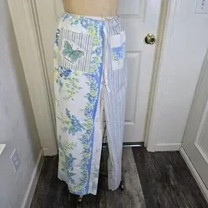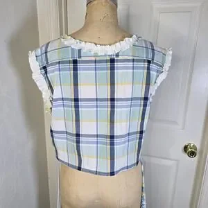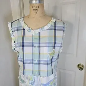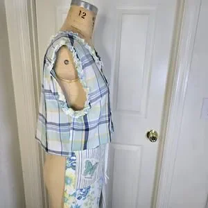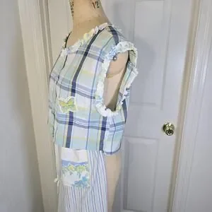 Great ragamuffin chic or cottagecore upcycled vintage floral print tablecloth with contrasting stripe fabric. Accents include pockets from fabrics embellished with butterflies taken from a vintage dishtowel. Top is an upcycled mans buttondown. Cropped, button front with sleeveless design. Accented with same vintage tablecloth fabric around neck and arm holes. Wear together or separately. 3265-rbh