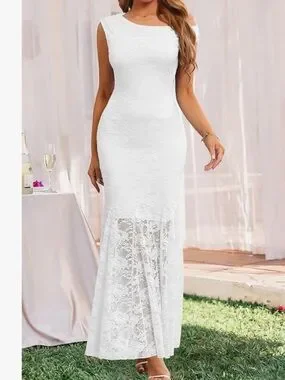 Stunning lace maxi dress in a timeless white shade. This figure-flattering bodycon silhouette hugs in all the right places while the delicate lace overlay adds a soft, romantic touch. Perfect for weddings, bridal events