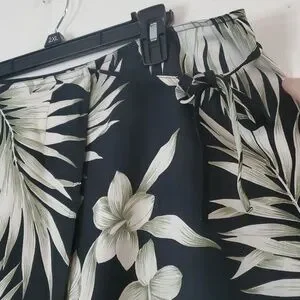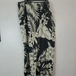 Silk maxi wrap skirt size 12. Black with big white floral design. Tie waist. Great pre-owned condition. Approximate measurements provided. Boho. Beachy. Preppy. Feminine. Resortwear. Vacation. Hawaiian. Tropical.