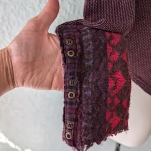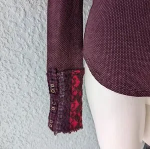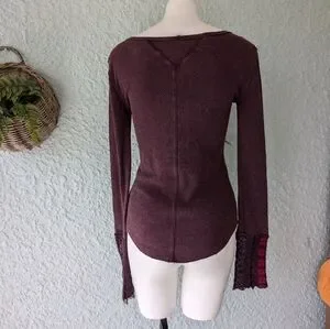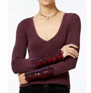 Free People Art School Embroidered S V-Neck Thermal Waffle Knit Long Sleeve Top