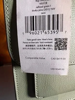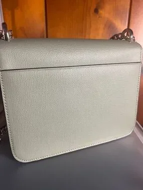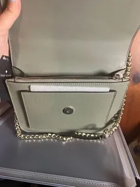 kate spade crossbody in green pebble leather. Features a gold chain strap and flap closure. Subtle logo plaque on front. Sleek, structured silhouette for polished looks.