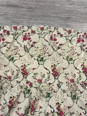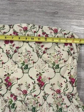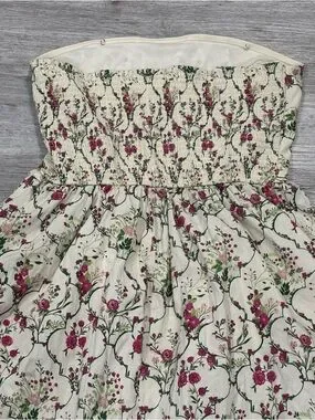 Strapless maxi dress by Jessica Simpson. Cream base with pink floral print and green foliage. Flowy A-line skirt. Feminine and breezy style. Ideal for spring or summer events.