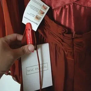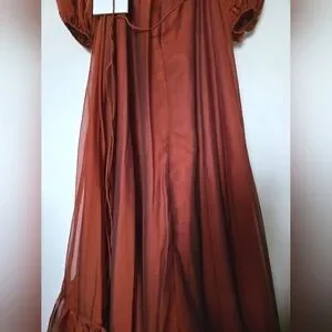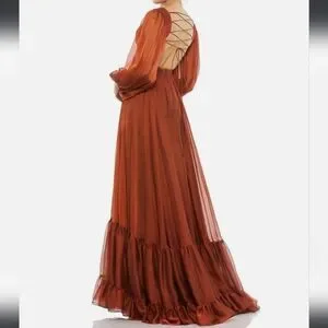 Stunning rust maxi dress with long sleeves and ruffle details. Perfect for formal occasions.