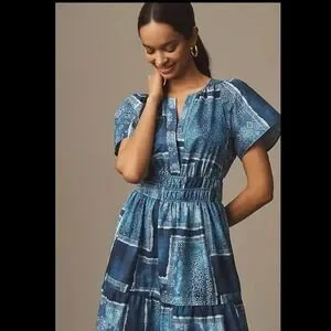 Anthropologie's iconic Somerset Dress features a soft A-line silhouette, flattering smocked waist, and everyday-elegant tiers. Cute patchwork-look denim bandana print in blue.