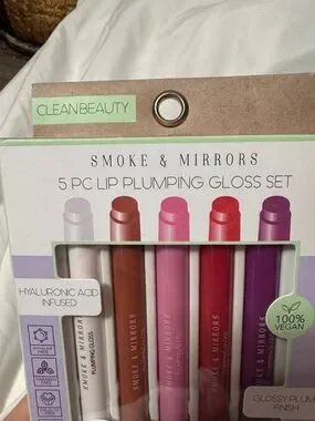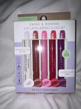 Smoke & Mirrors 5-piece lip plumping gloss set. Hyaluronic acid infused for smooth, fuller-looking lips. Includes a range of pink, mauve and purple shades for versatile wear. Glossy plump finish with moisturizing formula. 100% vegan and formulated for comfortable, non-sticky wear.