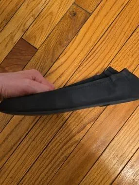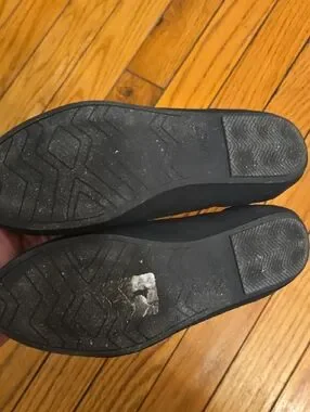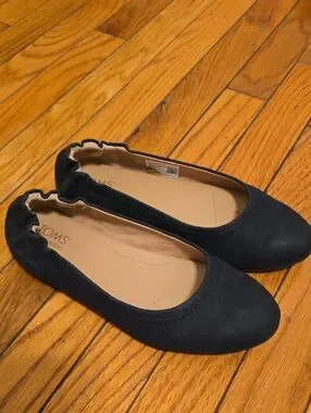Classic slip-on ballet flats by Toms. Soft rounded toe and elasticized heel for a snug fit. Smooth black upper with cushioned insole for comfort. Simple, versatile style for everyday wear.