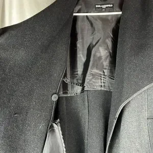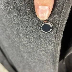 This is a great dark gray Karl Lagerfeld Paris wool blend belted women's coat! It is a large women's. Pit to pit is 21 inches and shoulder to hem is 37 inches. There is a button clasp and a tie. It is in great condition.