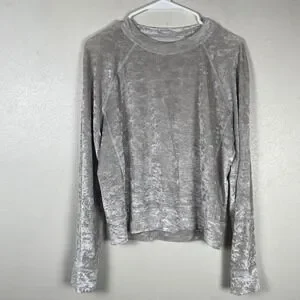 Lululemon Perfectly Oversized Crewneck Pullover in a luxurious crushed velvet fabric offers a soft, textured feel with a relaxed silhouette. This long-sleeve top features raglan sleeves and a classic crew neckline, blending athletic comfort with an elevated, shimmering aesthetic. The neutral champagne or light silver tone makes it a versatile piece for layering or wearing as a standalone statement.
