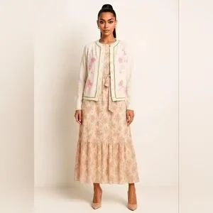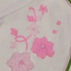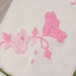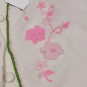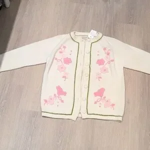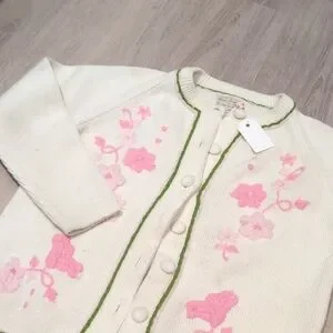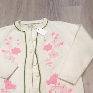 Charming vintage cardigan with a floral design. Soft white knit fabric with pink accents, perfect for layering.