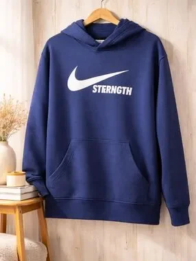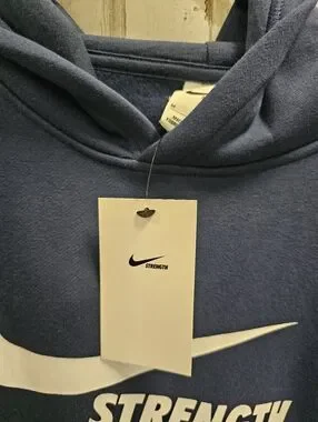 Comfortable blue Nike pullover hoodie with a bold white strength logo on the chest. Soft fabric for everyday wear and a relaxed fit for layering. Features a kangaroo pocket and attached hood for extra warmth. Easy-care design is ideal for casual outfits.