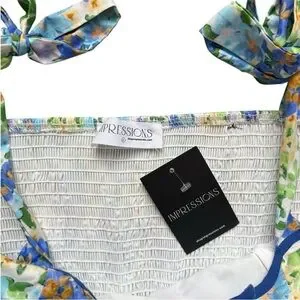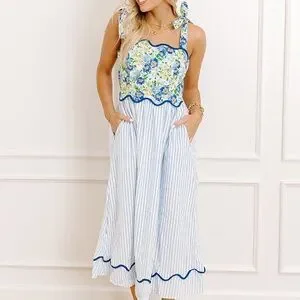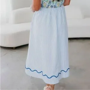 Step into a world of charm with this midi, where delicate stripes and scalloped details bring a fresh, playful vibe. - smocked back - waistline with a scalloped front and an elastic back - striped print on the skirt featuring different blue hues - Hidden side pockets - Scalloped accents on the bottom of the skirt - flowy silhouette that ends in a straight, midi length hemline