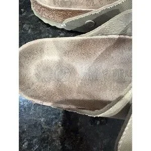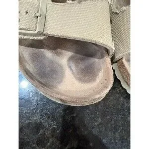 Birkenstock Arizona sandals are the easy win for everyday comfort. The beige textile/canvas upper keeps the look clean and casual, while two adjustable buckle straps let you dial in the fit. Underfoot, the contoured suede-lined cork footbed supports you from quick errands to long walks. Perfect for casual weekends, travel days, and laid-back summer hangouts. Pre-owned: well loved but plenty of life left.