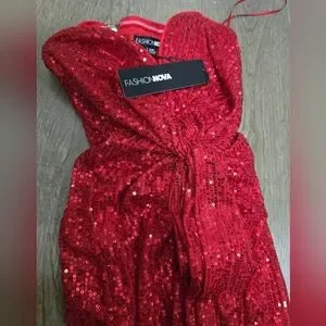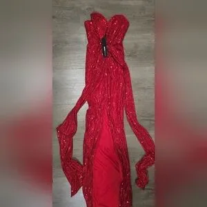 Shine bright in this red sequin dress. Features a fitted design with a stylish slit. Ideal for prom or special events.