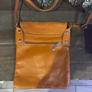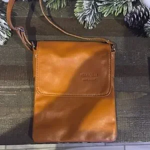This Vera Pelle messenger bag features a warm brown color and is crafted from smooth high-quality leather, showcasing a slight sheen. Its classic design includes clean lines and a flap closure, making it a stylish yet functional accessory for carrying essentials.