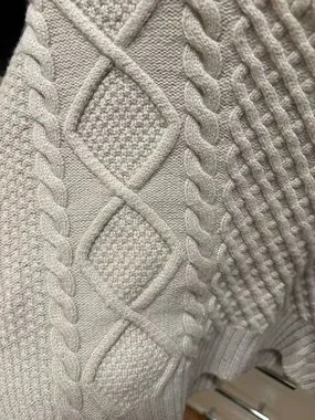 Chunky cable-knit sweater with varied textured panels. Cropped silhouette with ribbed crewneck, cuffs, and hem. Soft knit ideal for layering and everyday wear.