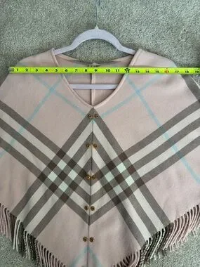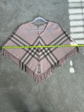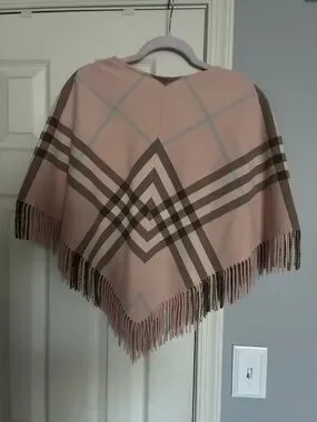 Burberry soft pink plaid poncho with fringe hem. Classic check pattern in taupe and cream with pale blue accents. Has been professionally reworked due to having hole in it. Button-front detail. Buttons for show only. Cozy and stylish layering piece. Please see pictures for sizing! Fits so nicely and very comfortable!! Make offer!