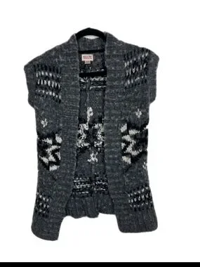 Soft grey open-front sweater vest with subtle black and cream geometric patterns. Comfortable knit fabric that layers easily over tops. Sleeveless design with a relaxed fit for everyday wear. Easy-care style that adds texture and warmth to outfits.