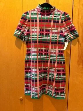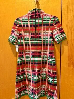 Vibrant plaid knit dress with short sleeves. High neckline and straight silhouette. Bold stripes in multiple colors for a playful look. Original price was $148