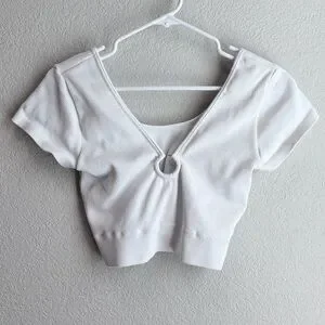 Aerie White Short Sleeve Cropped Top w/ Gold Circle V Neck. Ribbed and stretchy material. Fitted.