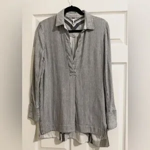 Chic navy and white striped top. Features a textured fabric and a relaxed fit.