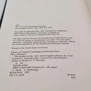 Alexander Eliot explores how ancient legends and mythology continue to influence and shape the modern world. This hardcover edition from Continuum Publishing includes a foreword by Eliot Deutsch and a preface by Robert A. F. Thurman. The text provides a free-associative narrative that connects historical myths to contemporary life and art.