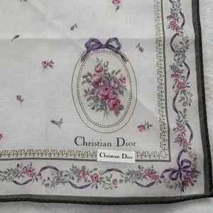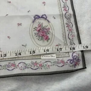 This CHRISTIAN DIOR square handkerchief features a delicate floral pattern with pink and purple roses and ribbons, with a central floral cameo design and a contrasting dark hand-rolled edge. Crafted from soft 100% cotton — wear it as a pocket square, neckerchief, or tied on your bag.