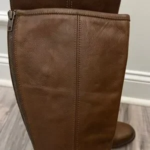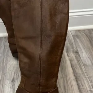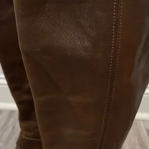 Step out in style with these elegant brown leather knee-high boots. Perfect for any occasion, they offer both comfort and sophistication.