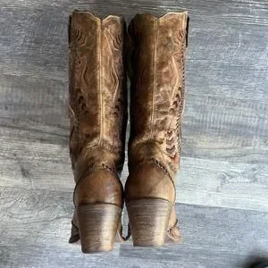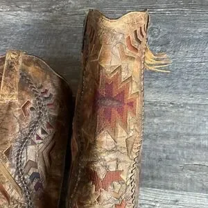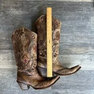 Elevate your western wardrobe with these stunning, handcrafted Corral boots. Featuring intricate Aztec embroidery and distinctive whipstitch detailing, these boots blend rugged durability with artisan style.