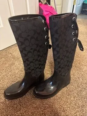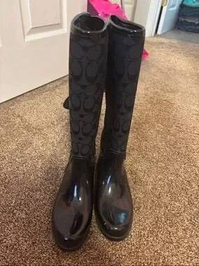 Tall rain boots with Coach signature logo shaft. Glossy black rubber toe and trim. Sleek, waterproof design for rainy days.