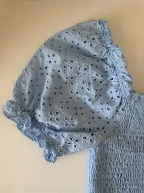 A light blue puff sleeve crop top with smocked bodice for a comfortable, flattering fit. Eyelet puff sleeves add a feminine, airy touch. Elasticized neckline and hem offer easy wear and movement. Perfect for casual looks and warm-weather outfits.