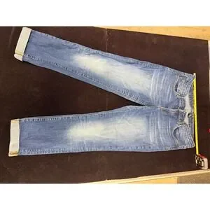 Gap Skinny Roll Up jeans in a medium wash denim with classic five-pocket styling. These versatile jeans feature a mid-rise fit and a skinny leg silhouette that can be worn cuffed or uncuffed. The fabric blend includes a touch of spandex for comfortable stretch and shape retention throughout the day. Finished with a zip fly, button closure, and subtle whiskering at the hips for a lived-in look.