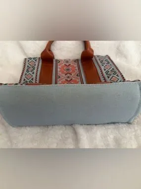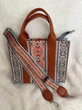 Stylish woven tote with brown leather-look handles and trim. Features orange and cream on a light blue background with an Aztec-inspired pattern for a vibrant, modern look. Adjustable patterned matching strap allows shoulder or crossbody wear. Lightweight and versatile for everyday use.