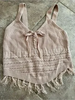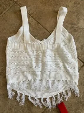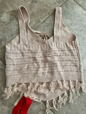 Fringe Tie Front Knit Crop Festival Party Top Red White and Beige size Small