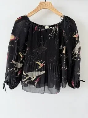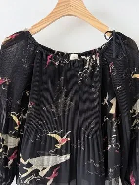 Aritzia Wilfred Black Pleated Sheer Bird Turtle Print Off Shoulder Top Size XXS