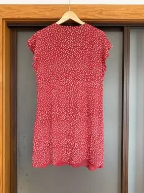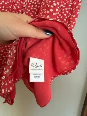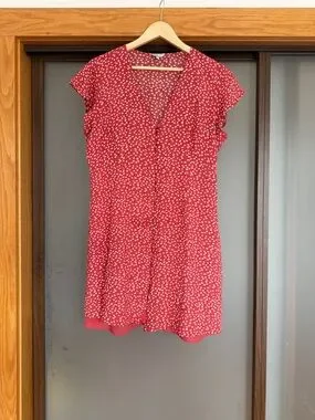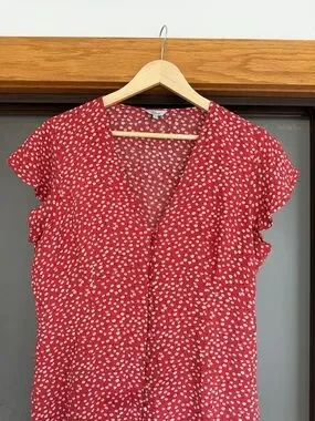 Rails Helena Carmine Daises mini dress in a bright red with small white floral print. V-neckline with short flutter sleeves. Button-front detail and a gentle A-line skirt. Lightweight and easy to wear.