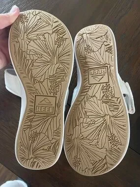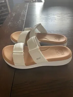 Lightweight Reef slide sandals with two adjustable straps. Soft cushioned tan footbed for comfort. Easy slip-on style for everyday wear.