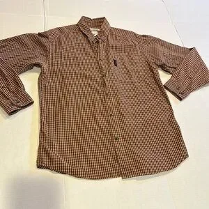 EUC button down long sleeve shirt that can be unisex. Colors of brown’s burgundy creams and tans. Lightweight
