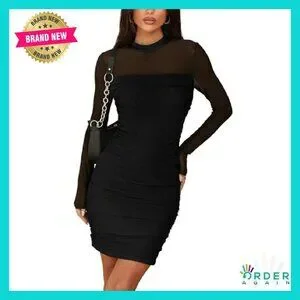 Sheer Mesh Long Sleeve Bodycon Mini Dress Ruched Mock Neck Party Wear