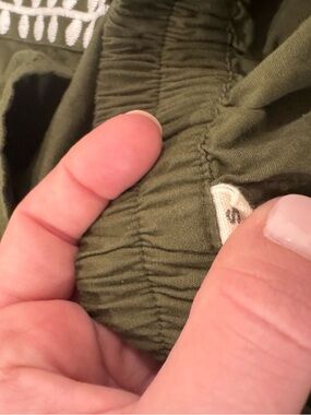 Lightweight olive green shorts with white embroidered trim. Elastic waist for a comfortable fit. Versatile casual style that pairs well with matching tops or tees. White embroidery adds a feminine, detailed finish. Top runs small. Shorts are TTS. Pit to pit measurement is approximately 16”