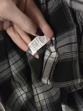 Black and white plaid skirt with an asymmetrical handkerchief hem. Tie waist gives the look of a plaid shirt tied around your waist. Super stretchy waistband.