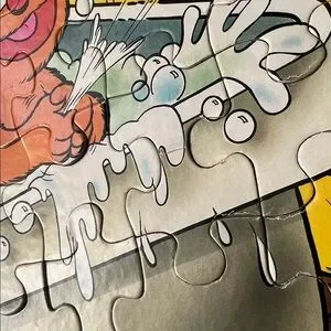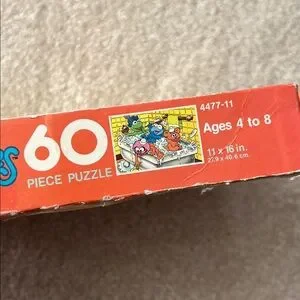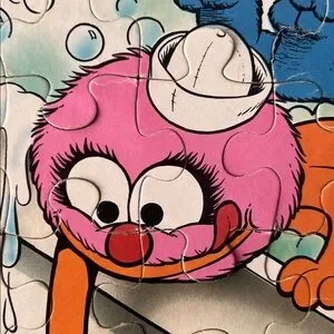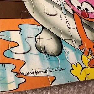 This puzzle has been well loved but has a little life left, full of 80s kid nostalgia measuring 11” x 16” this Bathtime scene puzzle has bright illustration!! Some curved/ crackled pieces and box is in rough condition.. but overall very sweet!!