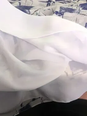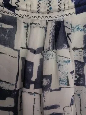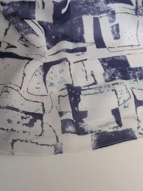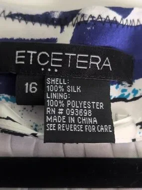 Etcetera white blouse with navy abstract print. Lightweight silk fabric with stylish Embellished round neckline for subtle detail. Easy, breezy silhouette perfect for casual or dressy looks.