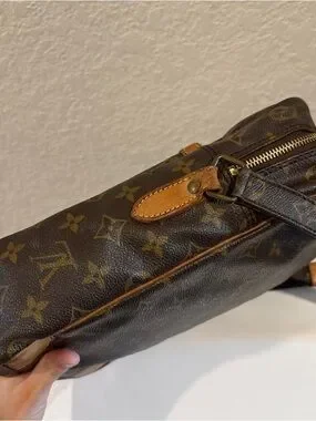 Classic Louis Vuitton monogram shoulder bag. Adjustable shoulder strap with leather pad. Leather trim and corner accents. Front slip pocket for quick access. Iconic LV pattern for timeless style.