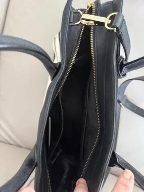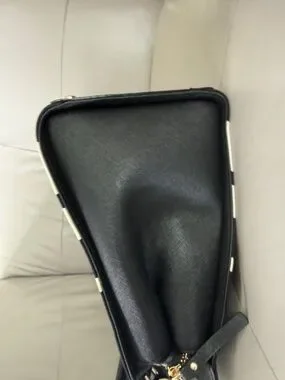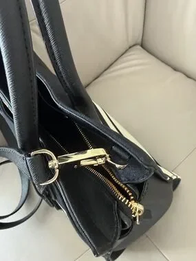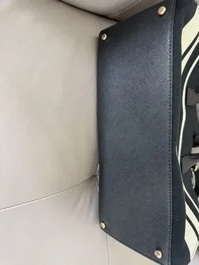 Structured satchel with top handles and an optional crossbody strap. Bold horizontal cream colored stripes on a black canvas body. Gold-tone hardware and a leather hang tag accent. Sleek, polished look for daily use. Zip closure. Interior is roomy with one small zip compartment on one side and a divided slip pocket in the other side. Roomy main compartment. Bag has never been carried.