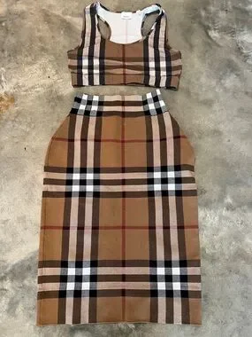 Signature Burberry plaid two-piece. Crop tank with racerback silhouette. High-waist pencil skirt with fitted shape. Classic tan base with black, white and red check detailing.