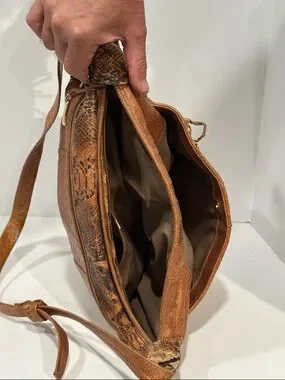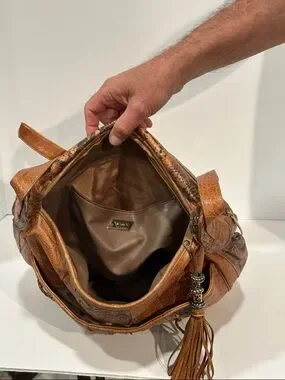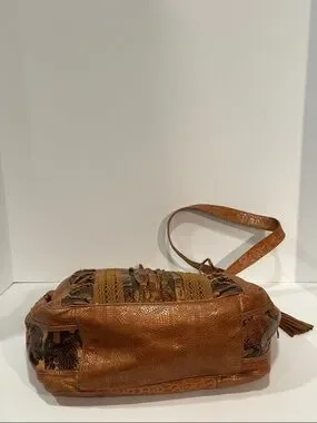 Approximately 14x11x4”. Masterclass in texture. Features Croco-embossed leather, python/snakeskin-embossed panels, and smooth tan leather and Laced "Corset" Detail. Two deep side slip pockets. Adjustable, wide shoulder strap. Signature Sharif tassel charm hanging from the strap base. Designed for everyday wear with a versatile single strap. The brown color complements casual and polished outfits.