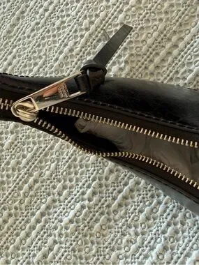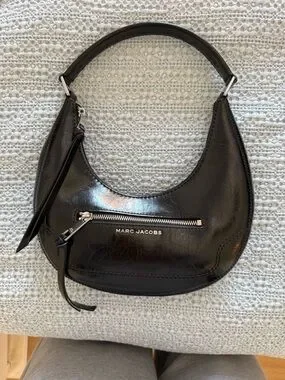 Curved crescent silhouette in glossy black leather. Exterior zip pocket and top zip closure. Adjustable shoulder strap with silver-tone accents. Subtle Marc Jacobs logo on front.
