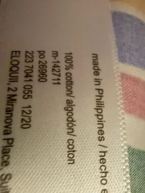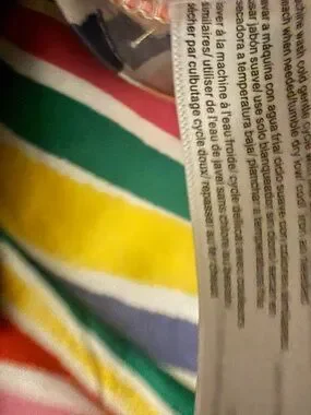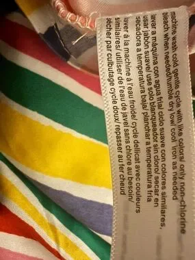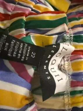 Off-shoulder silhouette with elasticized neckline. Puff three-quarter sleeves with tie details. Removable self-tie belt accents the waist. Vertical multicolor stripes for a playful look. Length 36” Waist 54”-56”.