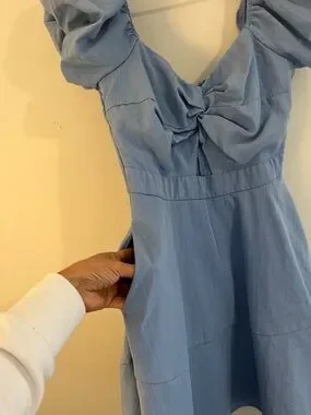 Soft light blue midi dress by Trixxi. Features puff sleeves and a front twist detail. Flared skirt for a feminine silhouette. Lightweight, breezy fabric. Elegant and playful design.